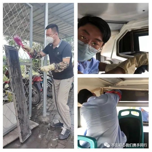 在清潔公交車外皮方面,以前的保潔員每刷一部車至少需要更換五桶水,換水、推水、刷洗這一整套操作流程下來,一輛車的外皮清理至少需要用15分鐘。五公司二隊為了提高清潔效率,歷時一個月經過多次發明創造、改良,終于將“移動噴刷一體式洗車機”自主研發成功!首先,他們將2厘米直徑的水管全部將洗刷公交車的長柄刷桿部套入,將刷頭和水管頭進行有效連接,將刷頭的刷毛進行裁剪至露出水管出水口。再次,他們將水管的另一端連接可移動電動抽水水泵,水泵開機后將水桶內的水進行抽取,水通過水管和刷柄連接縫隙進入刷頭,最終刷頭出現噴淋效果,讓公交車的清潔“樹上開花”!此項自主發明不僅達到了邊刷邊洗效果,還提高了清潔效率。五公司二隊的司機和保潔員也紛紛表示:現在刷一輛公交車的外皮只需要4分鐘,我們省力了,公交車也干凈了,真是一舉兩得!