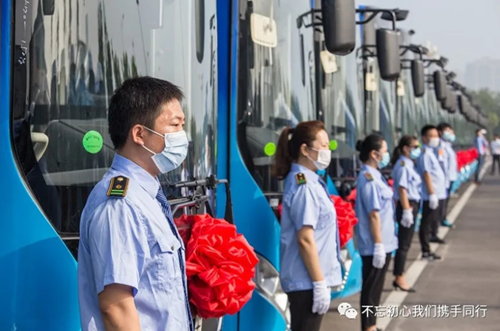 8月11日上午,唐山市新能源公交車上線運(yùn)營啟動(dòng)儀式在唐山站公交樞紐舉行,市委常委、常務(wù)副市長付振波,市政府副秘書長、“一港雙城”辦主任任艾泉,市人大城環(huán)委主任王玉升,市城管執(zhí)法局黨組書記、局長冀桂梅,市政協(xié)提案委辦公室主任劉貴臣,市交通運(yùn)輸局副局長李東興,市城管執(zhí)法局四級(jí)調(diào)研員石中波,總公司總經(jīng)理劉東占、黨委書記夏保良出席啟動(dòng)儀式。在啟動(dòng)儀式上,市城管執(zhí)法局黨組書記、局長冀桂梅同志致詞,總結(jié)概括近年來唐山公交事業(yè)發(fā)展取得成績(jī),全面介紹了純電動(dòng)公交車更新?lián)Q代情況,市委常委、常務(wù)副市長付振波同志宣布2020年唐山市新能源公交車正式啟用上線運(yùn)營。