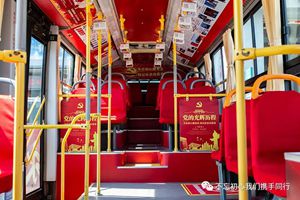 整條線路以黨史和黨的路線方針政策為主題,在車廂內進行了多種方式的宣傳:車內方便乘客站立時使用的小小拉環,一面是“唐山黨史”公眾平臺二維碼,乘客可用手機掃碼,利用乘坐公交車的間隙學習黨史,另一面是黨的歷史大事件、十九大精神等內容;主題車廂以紅色背景為主基調,對中國共產黨百年歷程的重大決策、重要會議、重大歷史事件,設計制作了圖文并茂的宣傳畫,在車廂內進行展示。